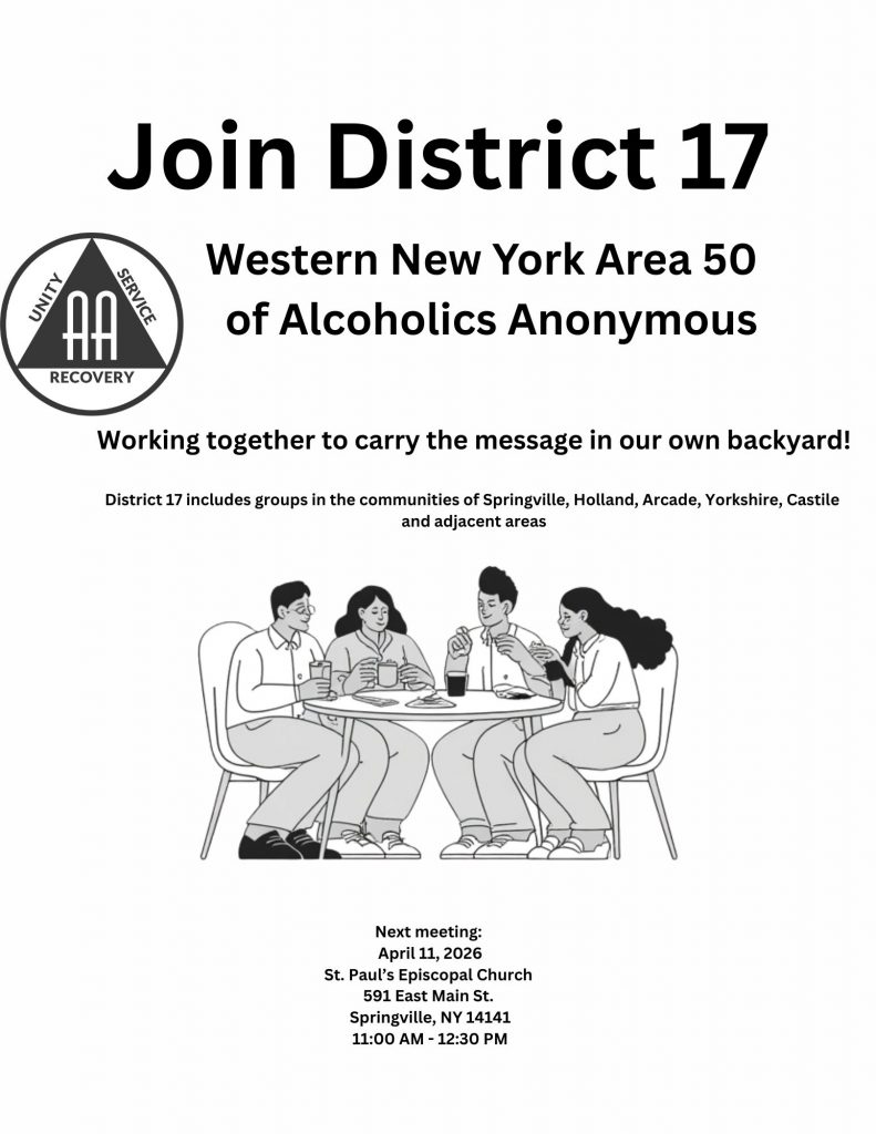 District 17 Meeting Event Details Date: April 11, 2026 11:00 am – 12:30 pm Venue: St. Paul Episcopal Church Categories: District St. Paul’s Episcopal Church 591 East Main St. Springville, NY 14141